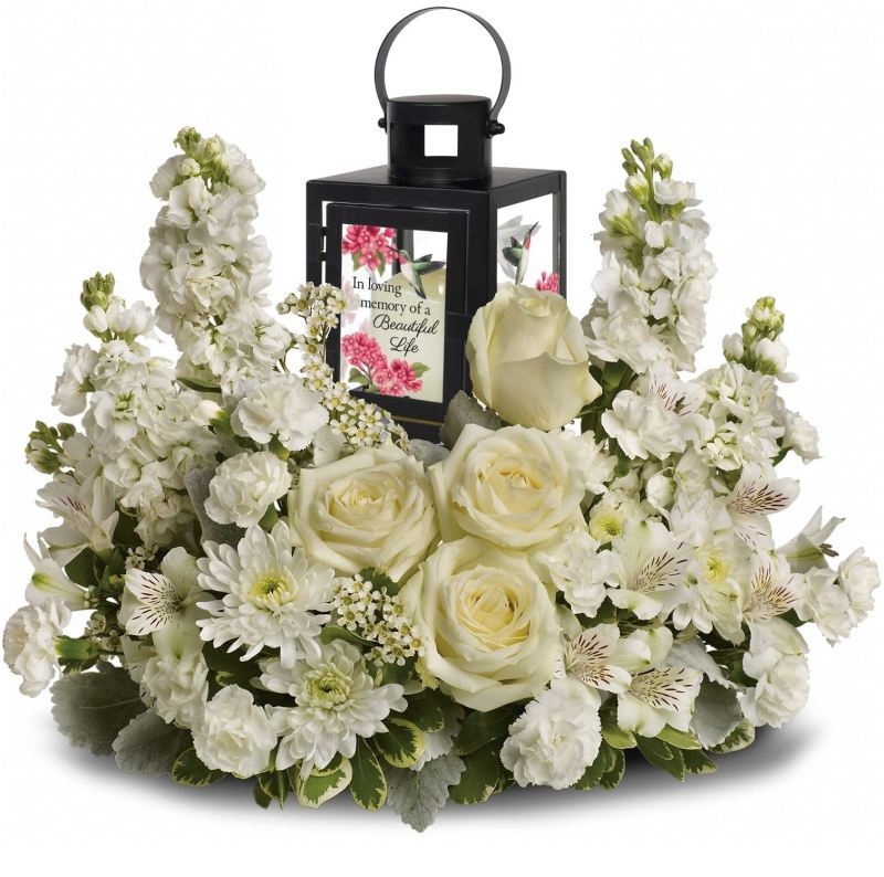 A radiant celebration of a beautiful life, this bouquet of serene white blooms surrounds an LED lantern keepsake with the sentiment "In Memory of a Beautiful Life".