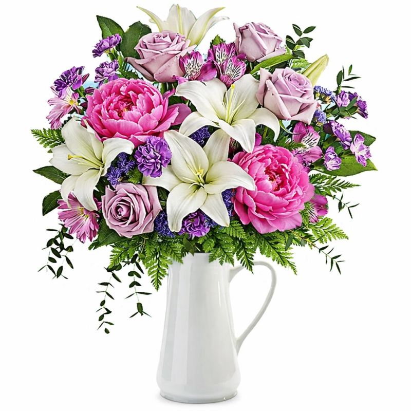 Three cheers for this delightful mix! Arranged in a keepsake ceramic pitcher - a lovely gift - this mix of favourite blooms is a guaranteed smile-getter. Approx. 20" H x 18" W