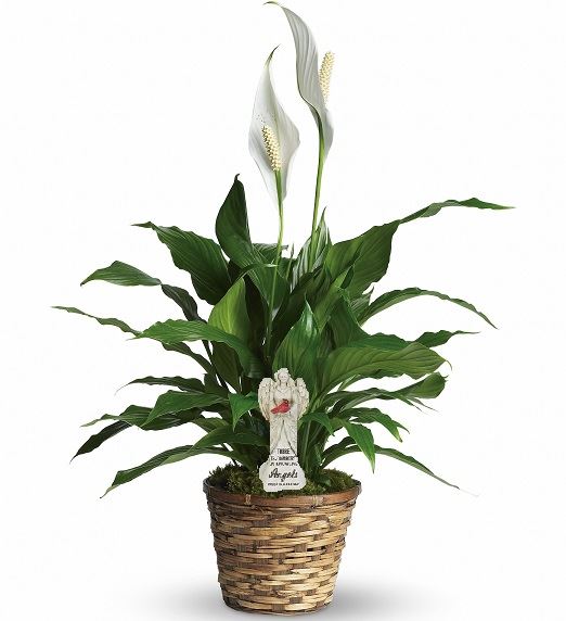 This living peace lily plant is carefully embellished with an angel statuette plant stake with a message of sympathy. Plant is in 6" pot. Angel with be one of 3 assorted designs. Approx. 22" h x 22" w.