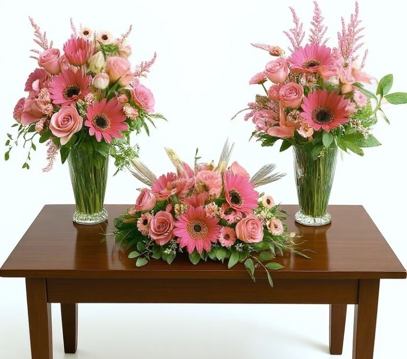 Pink tones and lush greenery create a gentle expression of love and remembrance. This three-piece set includes a central arrangement and two matching vases, ideal for a memorial table or arc display. Flowers are a seasonal mix and include chrysanthemums, carnations and roses. Handcrafted with care by Jackman’s Flowers in North Bay.