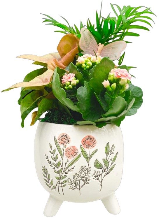 Desk-size planter featuring a mix of tropical plants and a blooming kalanchoe, beautifully arranged in a modern ceramic tripod planter. Planter measures 6" in diameter—perfect for adding a fresh touch to any workspace or small space.