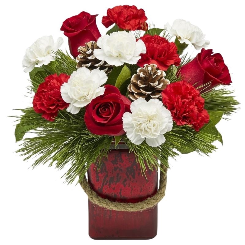 Share the holiday spirit. A glass vase holds festive red and white carnations accented with holiday greenery and pinecones. Note: vase may be red or clear. Approx. 12"w x 12"h.