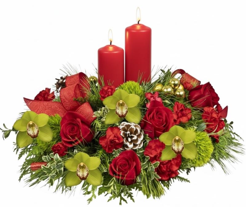 Capture the charm of the holiday season with fresh roses, orchids, carnations and evergreens cradling cozy candles aglow with soft candlelight. Approx. 15" w x 15"h.