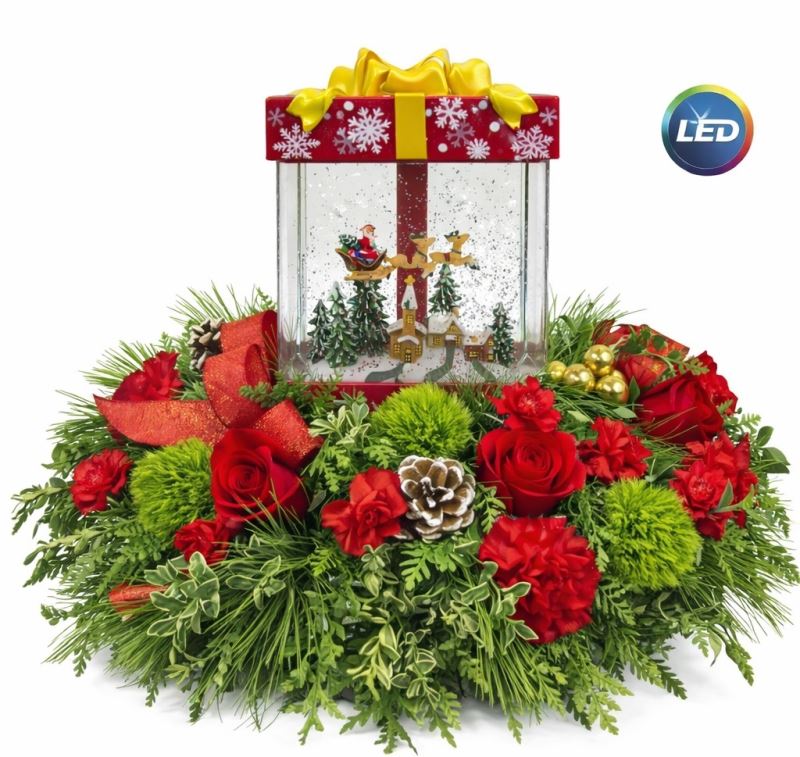 A two-in-one holiday gift, a keepsake LED snowglobe lights up featuring Santa's sleigh, surrounded by a mix of fresh evergreens and holiday blooms. Approx. 12" h x 15" w.
