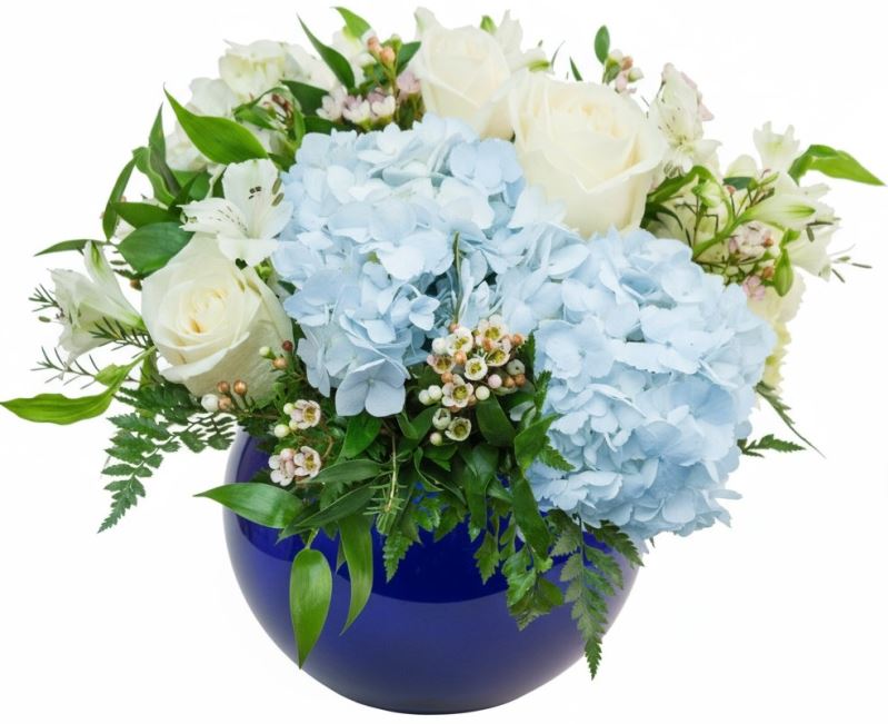 Soft, elegant, and full of meaning — Grace and Gratitude is a stunning floral display that beautifully expresses appreciation, comfort, and care. This tasteful design features white roses, white alstroemeria, and soft blue hydrangea, artfully arranged with fresh greenery in a clear glass bowl. Approx. 10" h x 10" w