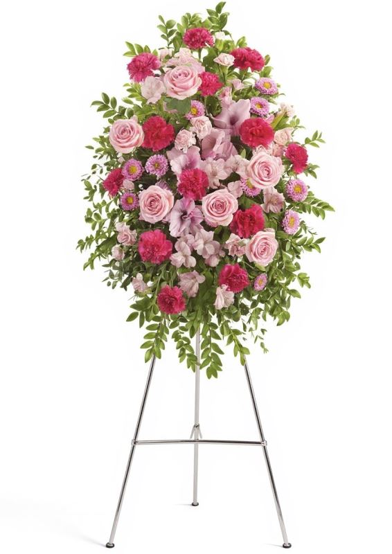 Honour a loved one with the Graceful Memories Easel Spray. Soft pink carnations, delicate alstroemeria, and lush greenery create an elegant standing arrangement, perfect for funerals, memorials, and celebration of life services. Approx. 25" w x 35" h.
