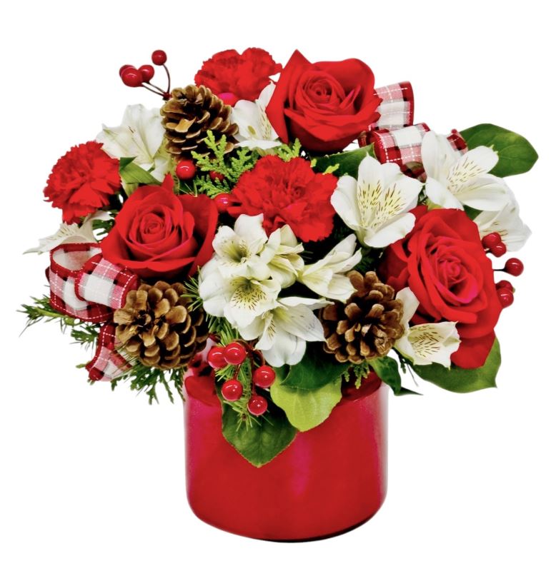 Bring the cozy charm of the holidays home with this festive arrangement red and white carnations, fragrant evergreens, pinecones, red berries, and cheerful plaid ribbon. Designed in a red keepsake container, this piece adds a touch of warmth to any table, desk, or gift list. Perfect for spreading Christmas cheer! 11"h x 11"w.