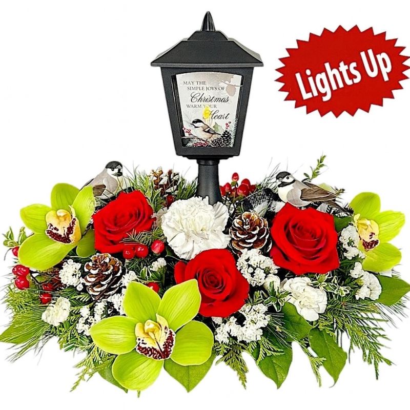 Celebrate the season with this elegant fresh Christmas centerpiece featuring a keepsake LED lamppost lantern that glows with the message “May the simple joys of Christmas warm your heart.” Designed with red roses, white carnations, fragrant white pine, cedar, red berries, pinecones, and festive ribbon, this arrangement brings cozy holiday charm to any table. Perfect for gifting or adding warmth to your own home. Approx. 20"w x 19" h.