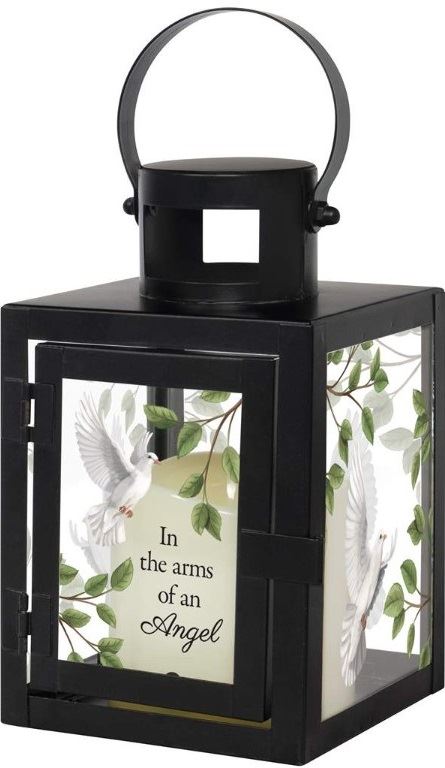 Flameless LED candle lantern made with high quality powder coated finish. For heartfelt sympathy and remembrance, standalone or with florals. Built in timer 6 hours on/18 hours off. 3 AAA batteries included. Hanging or freestanding. Weather friendly. 9.5" x 4" x 4" including handle.