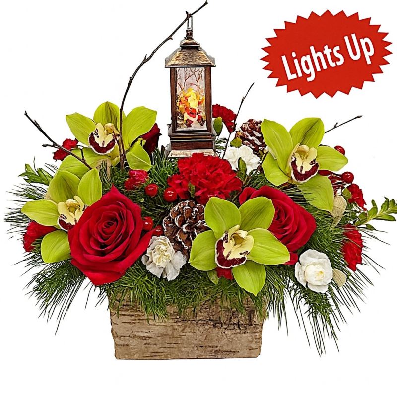 Bring the magic of the holidays home with this Jackman’s Flowers exclusively designed for North Bay and area. Fresh orchids, red & white carnations, pine, cedar, balsam & birch twigs are arranged in a rustic birch bark container. Nestled at the heart is a glowing LED mini snowglobe lantern (5" x 2" x 2"), a keepsake ornament to treasure year after year. Perfect for holiday décor or gifting.