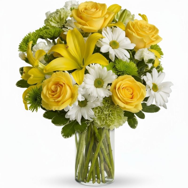 Let the sunshine in with yellow roses, lilies and other bright blooms in a sparkling clear glass cylinder vase. What a lovely way to say “hello” to friends near and far. You’ll make their week. Approximately 13 1/4" W x 15 1/4" H