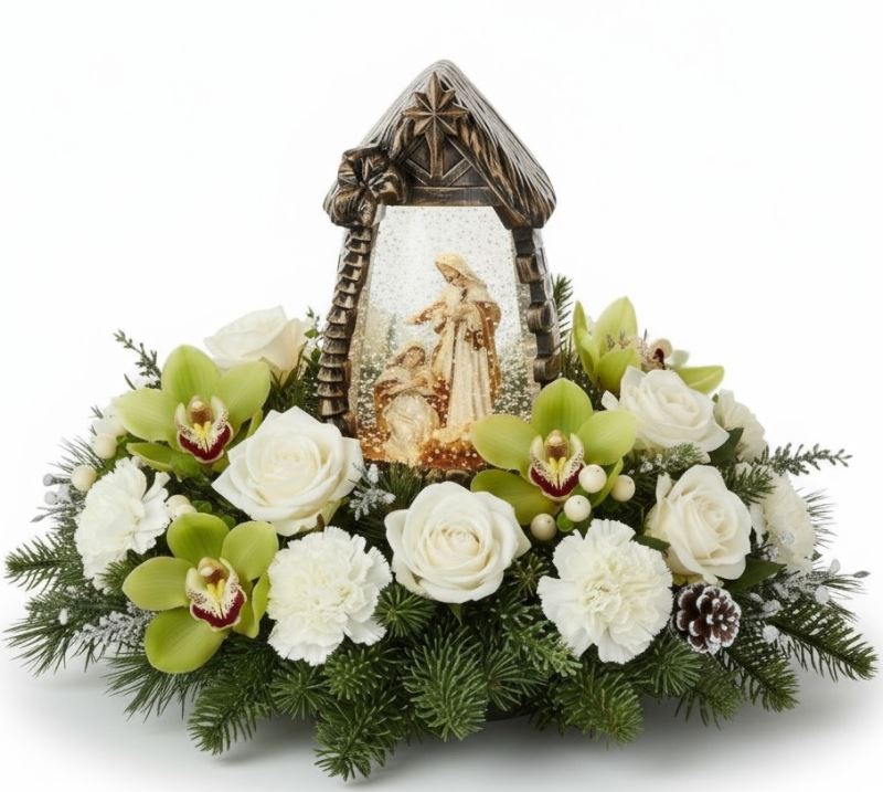 Exclusive to Jackman’s in North Bay! Fresh spruce, cedar, pine, white carnations & roses surround a glowing LED snowglobe lantern of the manger scene (keepsake to treasure for years). A perfect festive centerpiece or gift. Approx. 18" w x 14" w.