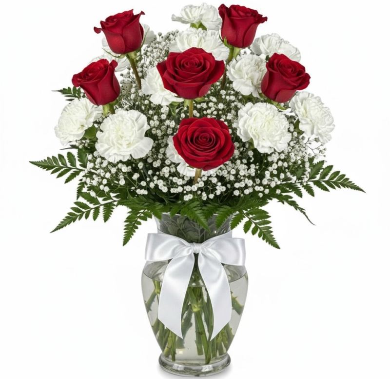Bring a sense of calm and comfort with our Peaceful Reflections floral display. This elegant vase arrangement features twelve pure white carnations, accented with baby’s breath and lush greenery, and finished with a white satin ribbon for a timeless touch. A beautiful way to express sympathy, remembrance, or condolence, this serene bouquet conveys heartfelt support and honors cherished memories with simplicity and grace. Perfect for a funeral service, memorial gathering, or as a sympathy gift delivered to the home. Approx. 12" w x 17" h.