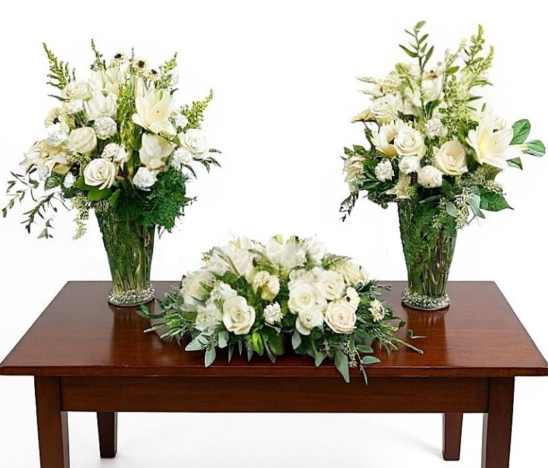 Elegant in whites and greens, this three-piece memorial floral set brings peace and grace to any service. Features a central design and two coordinating vases, perfect for chapel arc or table display. Flowers are a seasonal mix and include chrysanthemums, carnations and roses. Thoughtfully created by Jackman’s Flowers, serving North Bay with care.