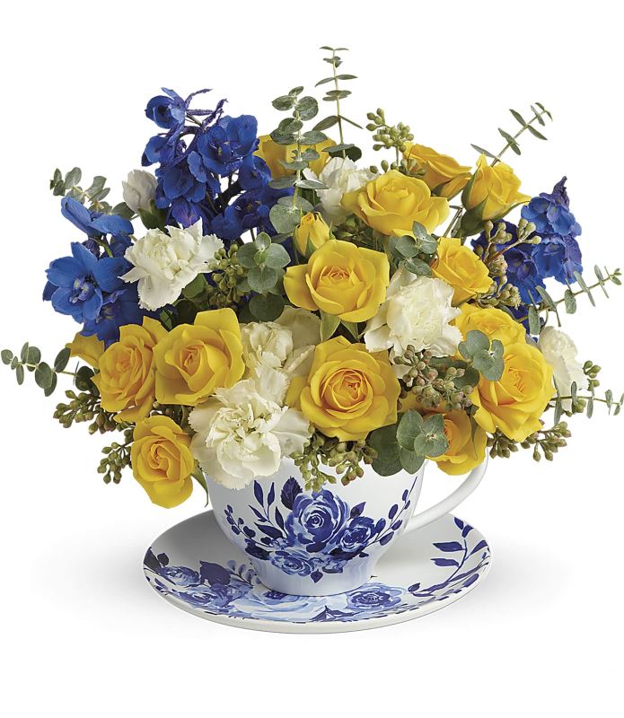 Pour on the charm! This elegant, Dutch-inspired teacup and saucer set is a pretty-meets-practical way to send a cheerful yellow and blue bouquet. Approximately 10" W x 9" H