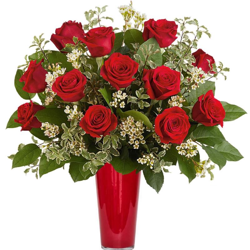 Make a stunning statement this Valentine's Day with luxurious long stem red roses, classic white oriental lilies, and delicate waxflower arranged in a dazzling red glass vase that radiates passion and confidence. Approx. 22" h x 19"w.