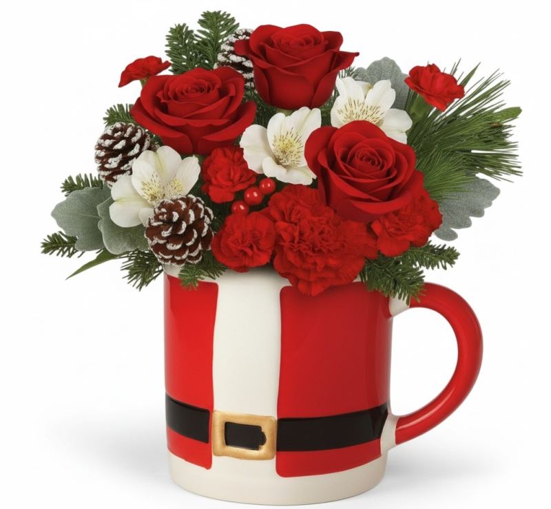 Celebrate the season with Jackman’s exclusive Christmas arrangement for North Bay. Red carnations, white alstroemeria, pine, balsam, pinecones, and berries are arranged in a Santa's themed mug for festive holiday cheer. Approx. 10" h x 11"w.