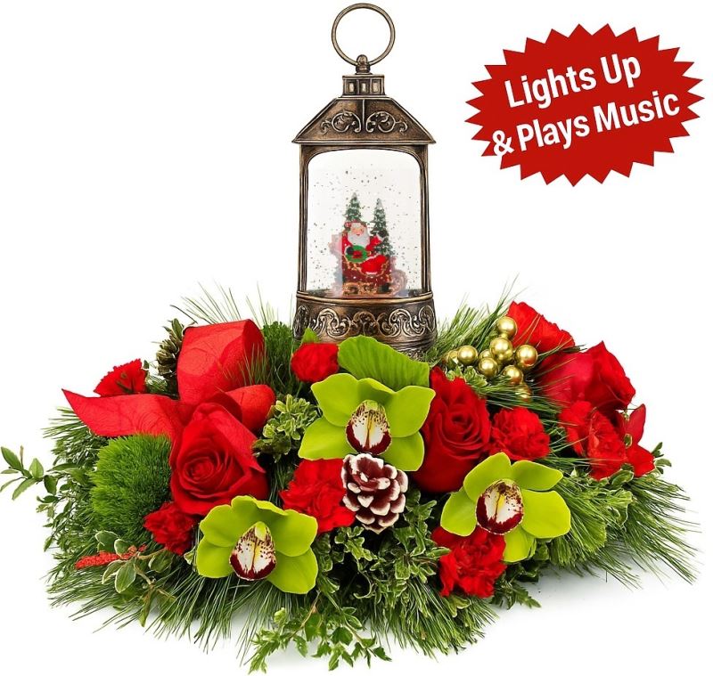 Add sparkle and joy to your holiday table with this festive fresh Christmas centerpiece featuring a keepsake LED snowglobe lantern with Santa in his sleigh. The snowglobe lights up and plays cheerful Christmas music, spreading holiday magic day or night. Surrounded by roses, orchids, carnations, fragrant evergreens, cedar, pinecones, and golden holly leaves, this centerpiece brings timeless Christmas charm to any home. Approx. 16"w x 14" h.