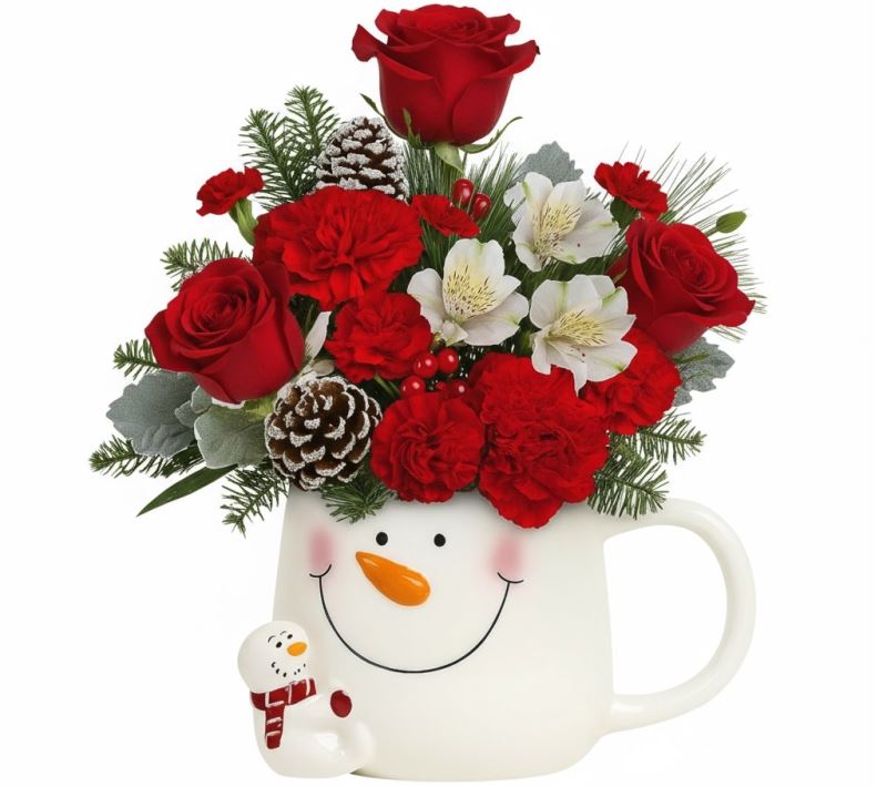 Celebrate the season with Jackman’s exclusive Christmas arrangement for North Bay. Red carnations, white alstroemeria, pine, balsam, pinecones, and berries are arranged in a keepsake snowman mug for festive holiday cheer. Approx. 10" h x 11"w.