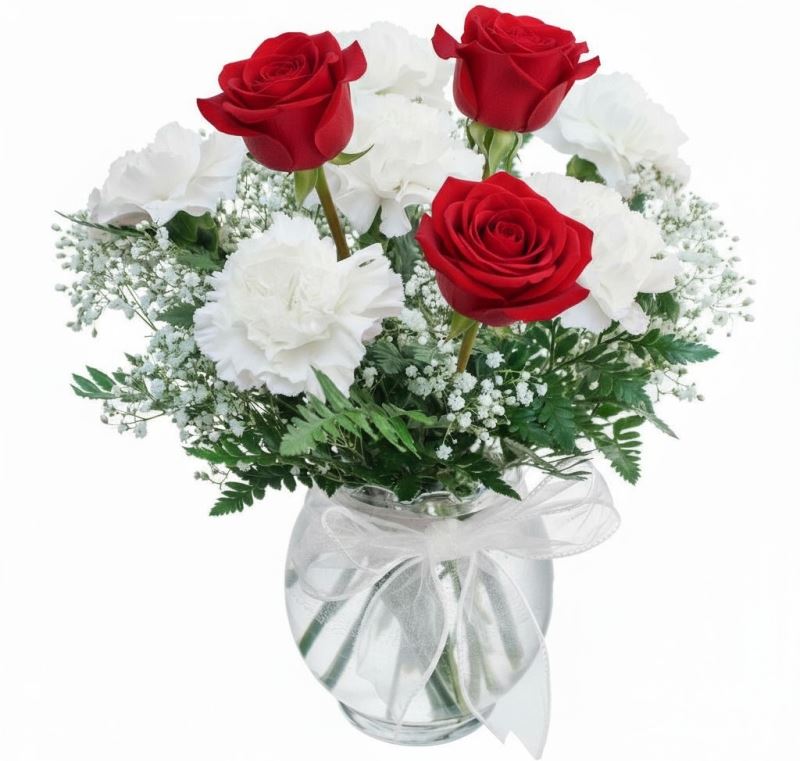Delight in simplicity with this petite arrangement of 6 white carnations, artfully presented in a glass ivy bowl. Perfectly sized for small spaces, this charming display adds a touch of elegance to any room. Approx. 8"w x 11"h