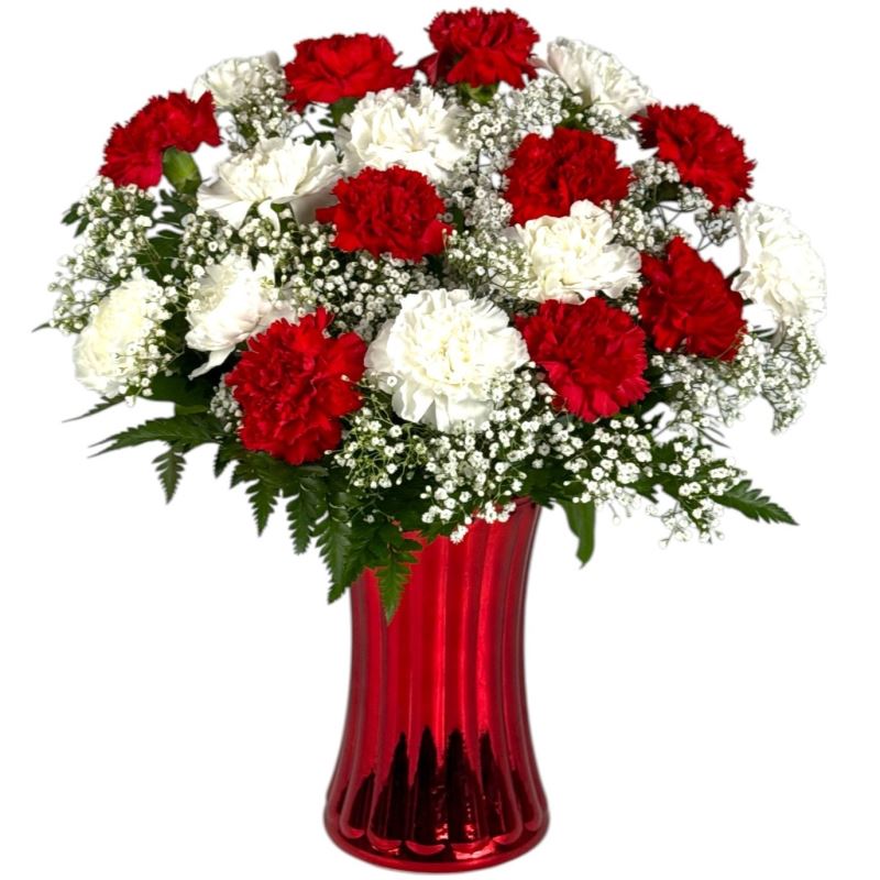 Surprise and delight them with long stem carnations designed in a glass vase with accenting filler flowers and greenery. Approx. 12" w x 17" h.