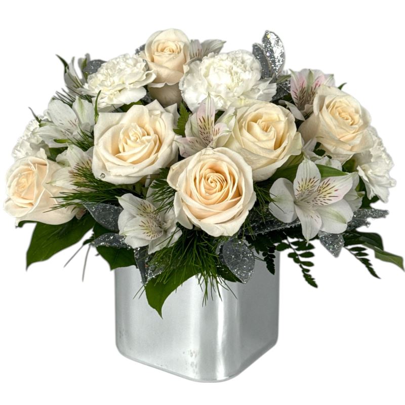 Celebrate the holidays with this elegant Winter Wonderland Bouquet. Featuring snow-white roses, carnations, and alstroemeria with sparkling silver accents, beautifully arranged in a silver vase. Perfect for Christmas gifts, festive décor, or sending seasonal cheer. Approx. 11" h x 11" w.